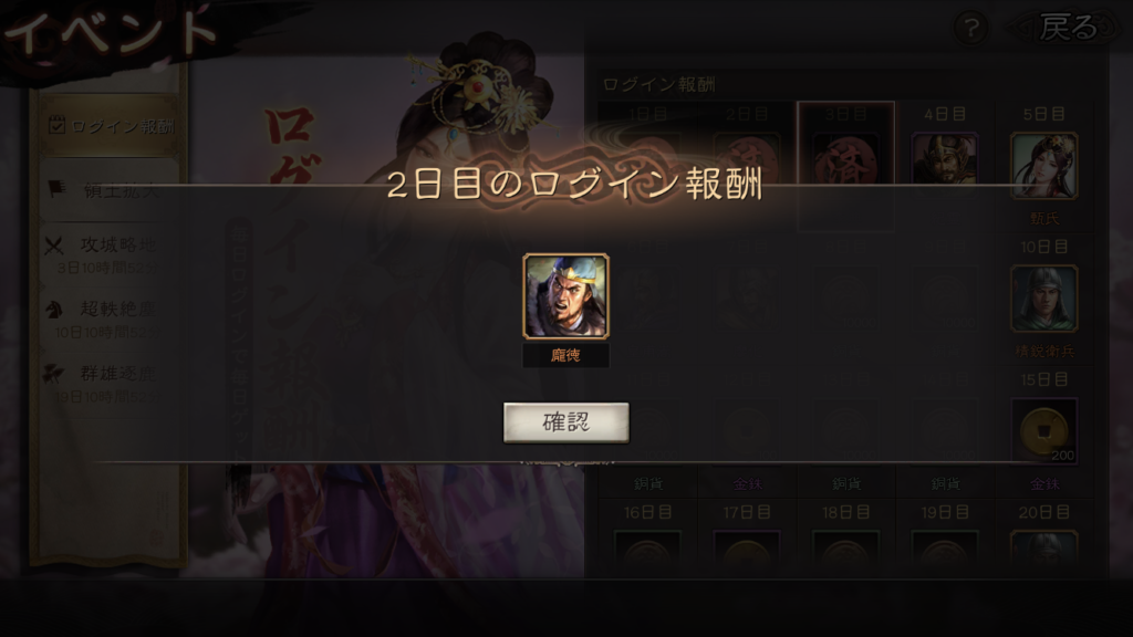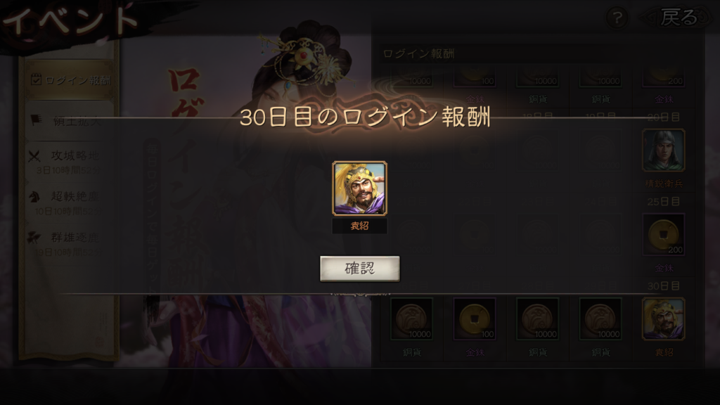 2日目には龐徳、5日目には甄氏、30日目には袁紹がもらえる✨!