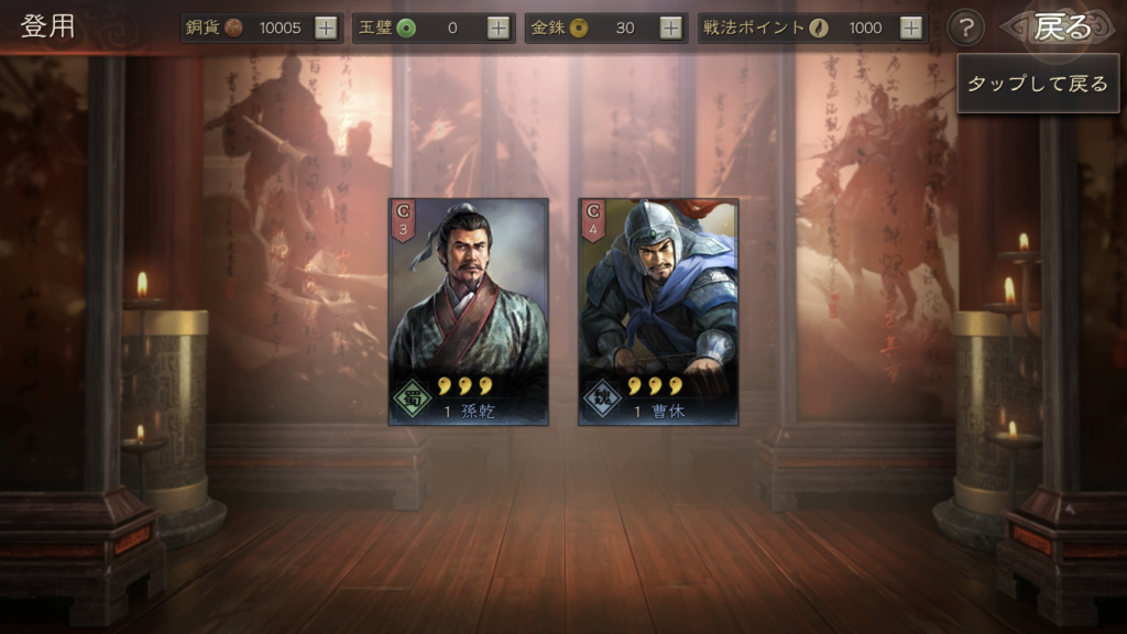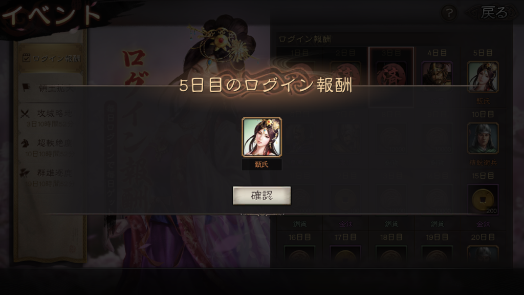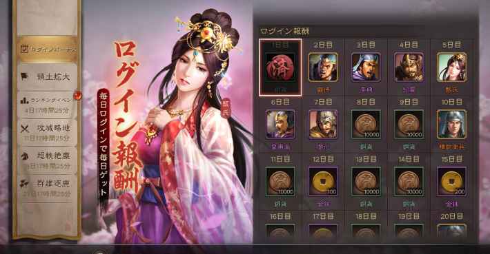 毎日ログインボーナスにて星5武将を5体も獲得できる。星5の武将となると、ガチャを回してもなかなか手に入らない武将ですね。それをログインで獲得できるとなると物凄いチャンスです✨
