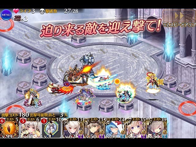 様々な方向から来る敵を手にした仲間と様々なスキルを使用して撃退する。