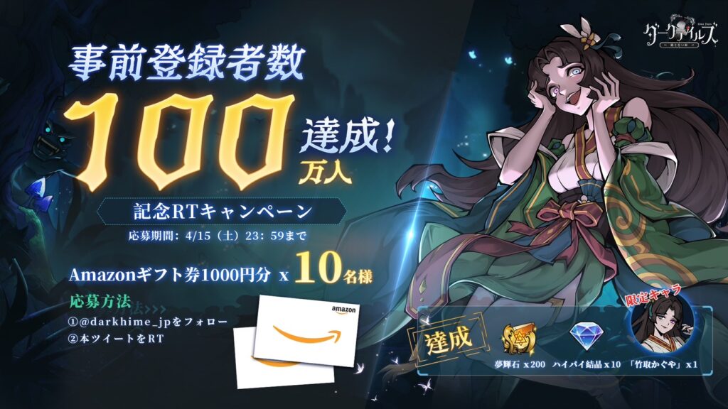 「ダークテイルズ」は基本無料で遊べますが、もちろん課金要素もあります。ですが、お金のない方にとって嬉しい最大1001連のガチャを引くことができ、童話のキャラクターを一気に手にすることが出来ます!さらに、事前登録の特典も豪華でリリースまで待ち遠しいほどです!事前登録100万人を突破すると限定キャラの「かぐや姫」が貰えます!この機会に一気に強くなりましょう!