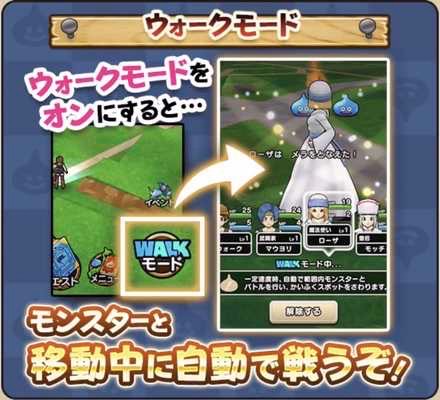 歩いて目的地まで行ってゲームを進めることができるのですが、ドラクエウォークは歩きスマホなしでも自動でバトルをしてくれる「ウォークモード」があります!他にも友達と一緒に冒険できたり、歩数やカロリーを測ってくれる機能もあります!