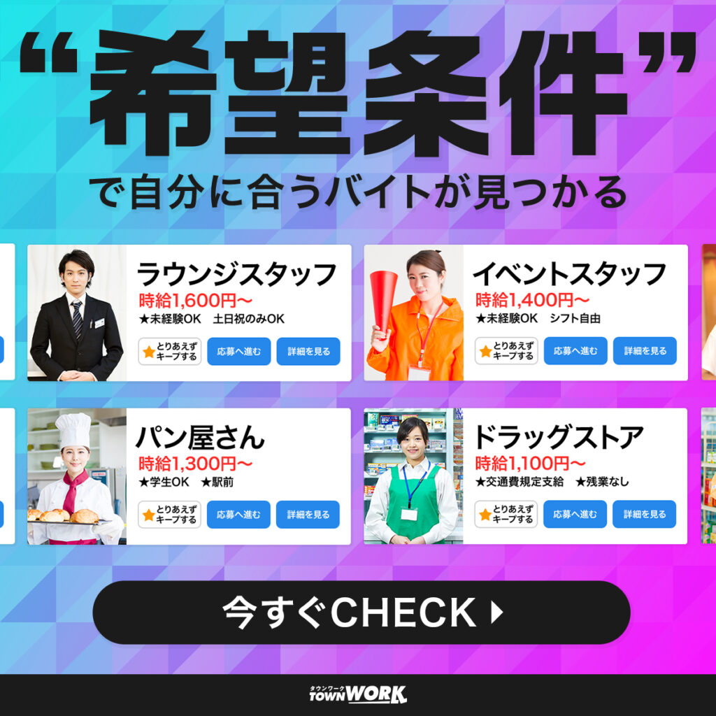 タウンワークは、求人情報を提供する国内最大規模のアプリです。タウンワークを使えば、幅広い職種の中から、自分の希望条件に合う最高の職場を見つけることができるでしょう!