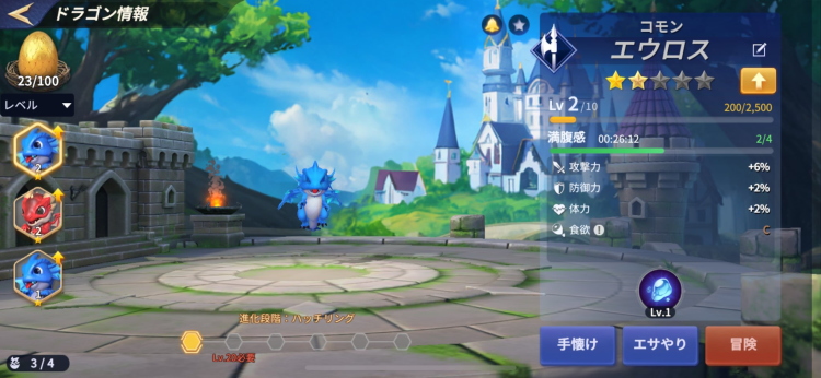 ドラゴンを卵から孵化させ手懐け(3マッチパズル)や餌やりなどをして育てていきます。